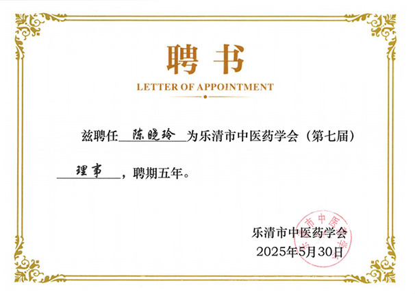 近日,乐清市中医药学会正式向陈晓玲颁发聘书,聘任其为学会第七届理事,聘期五年。这一聘任决定,不仅是对陈晓玲在中医药领域专业积淀与工作成果的高度认可,更标志着她将在推动乐清市中医药事业发展进程中,肩负起新的责任与使命。